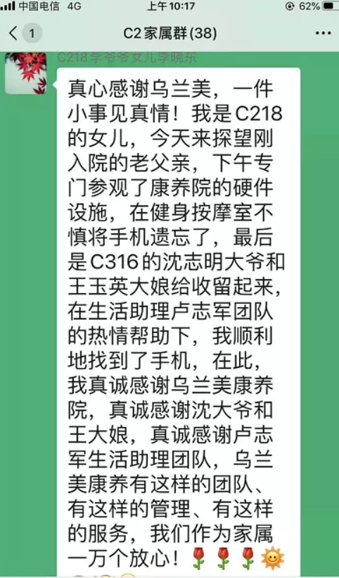 考慮到失主丟失財(cái)物焦急的心情,沈爺爺用餐過后便立即回到房間,正打算挨家挨戶找尋失主時,碰到了前來尋找手機(jī)的C區(qū)二樓生活助理團(tuán)隊(duì)們。“真的特別謝謝大家的熱心幫助,當(dāng)烏蘭美的護(hù)士和生活助理人員知道我的手機(jī)丟失后,都自發(fā)的幫我找尋手機(jī)。我真的感到特別的暖心,特別的貼心。經(jīng)過這次事情,我對我老父親住在這里一萬個放心!因?yàn)檫@里的工作人員不僅細(xì)心呵護(hù)、照顧老人,還守護(hù)了他們的財(cái)產(chǎn)安全。”